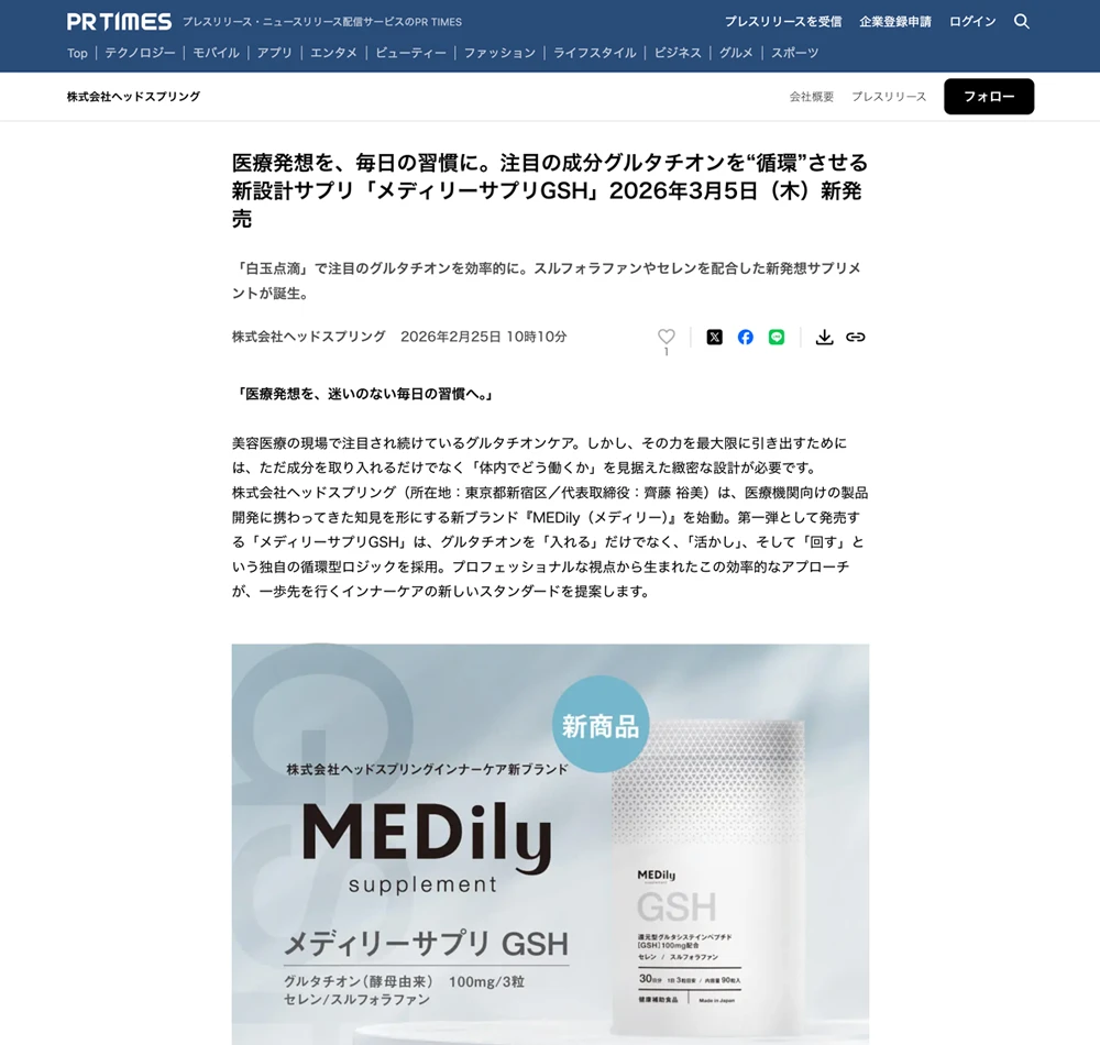 2026年3月5日(木)新発売 注目の成分グルタチオンを“循環”させる新設計サプリ「メディリーサプリGSH」がPR TIMESに掲載されました。